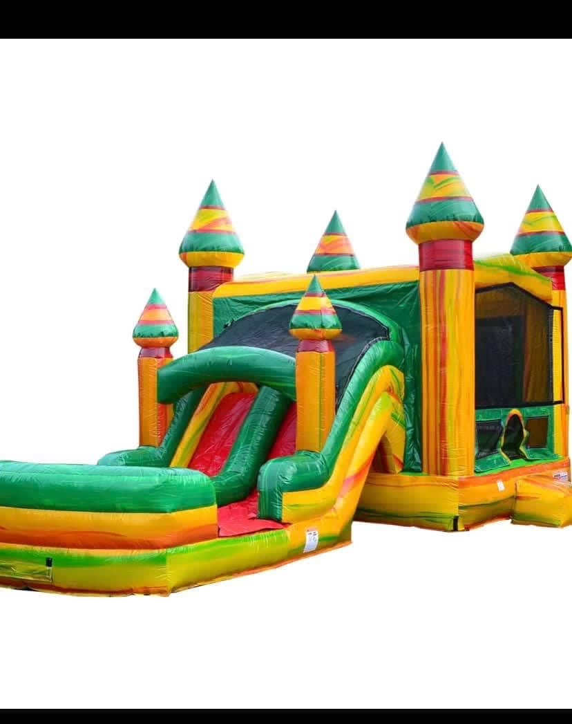Our Fiesta Duel Lane Combo is festive fun! With it's duel lane slide, basketball hoop, climbing wall, and bounce house it will definitely keep the kids entertained. The corners are where the inflated turrets are located. A marble yellow, green and red vinyl make up the body of the unit. The duel slides are front mounted, and is accessible from the inside of the bounce house. On the side of the bounce house is easy entrance/exit access.