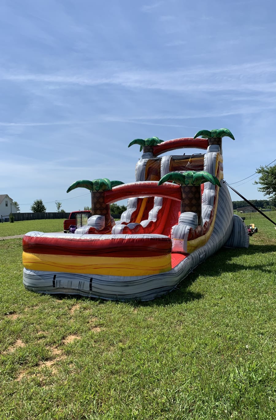 Need to cool off this summer? The Fire Island single lane water slide features large 3D palm trees, with a marble grey, red, and blue color scheme, and a large pool at the end. Perfect for all occasions and ages.