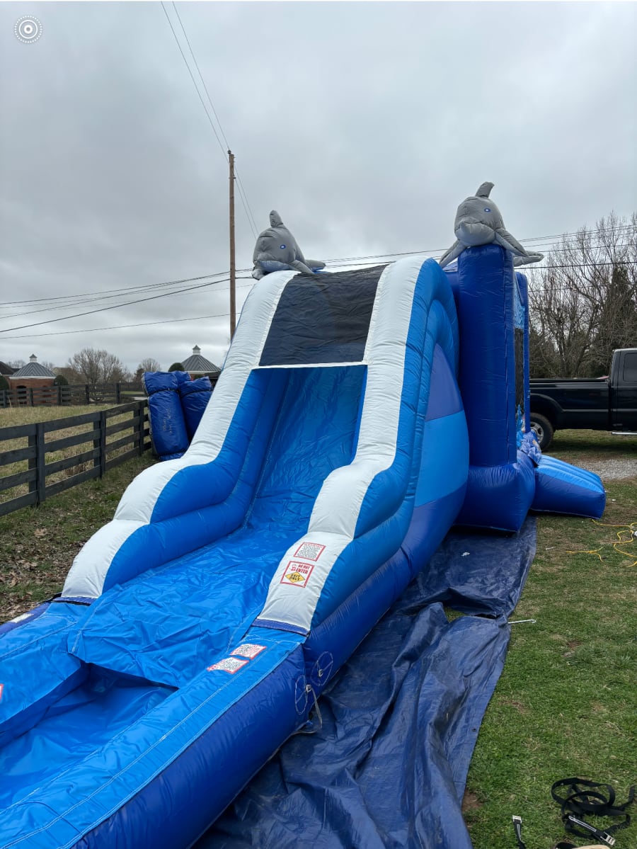 Introducing the Dolphin Breeze Combo, a delightful addition to your next event in Nashville, Columbia, Franklin, Springhill, and beyond! This bounce house and waterslide combo features a vibrant blue and white design with pl